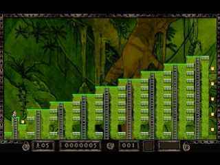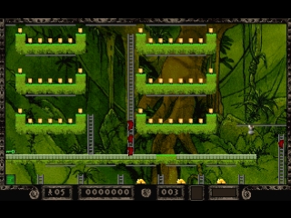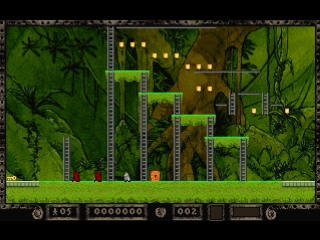 In The Legend Returns, the once green and fertile Earth is now a cesspool of filth, made this way by centuries of pollution. What remains of humanity resides deep within caverns, searching for gold, a substance still considered valuable. With enough gold, a person can buy safe passage from the planet. Chief among these Lode Runners is Jake Peril, a man who spends most of his time climbing ladders and ropes, walking across platforms, falling off platforms, digging holes and, of course, scooping up piles of gold.