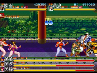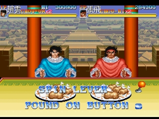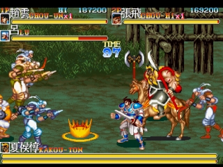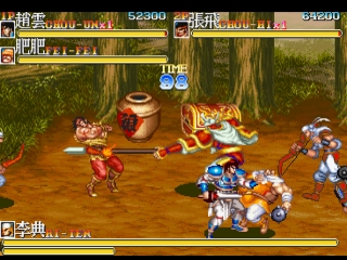 Tenchi wo Kurau II is a beat'em up with 9 stages, in each of which there are large mobs including spearman, archers, strongmen, bomb-wielding opponents, and at least one Wei boss. There can be up to three players on-screen at the same time. Using two buttons, Attack and Jump, the characters all have standard moves typical of Capcom side-scrollers of the day. Common enemies including Wei soldiers such as bandits, privatees, wrestlers, fatties and thieves will keep poping up from everywhere. In the end of each stage there is a Wei general as stage boss. Li Dian, Xiahou Dun, Xu Chu, Zhang Liao, Cao Ren, Xu Huang, the infamous Lu Bu as final boss. After defeating them all, there is also Cao Cao himself who would try to escape.