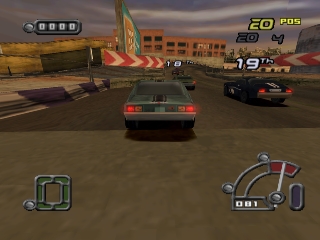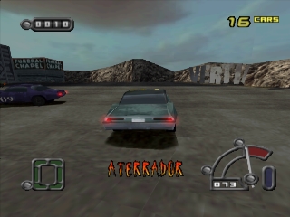 Smash 4 $ mode is fairly self-explanatory. To earn money (functionally equivalent to points), players are expected to liberally dole out damage to any of the other racers. High-speed collisions satisfy the basic requirement for "stunts." By pulling off a Corkscrew, Teeth Puller, or Bone Cruncher, players earn these much-needed points, and also cause real-time damage to the unlucky recipient's car. Point totals and finishing place all count towards a final point tally, which is in turn measured against a predetermined value. Players must earn enough to continue on to the next event. Accumulated cash can then be spent to upgrade or repair your vehicle.