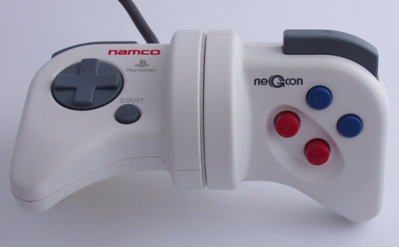 The neGcon was an unusual design in that the left and right halves of the controller were connected by a swivel joint and thus the halves could be twisted relative to each other. The full extent of this twist was available to the console as an analogue measurement. Also unusual for its time were the buttons. The regular PlayStation controller of the time featured all-digital controls with a D-Pad on the left; R1, R2, L1, and L2 shoulder buttons; triangle, circle, square, and X buttons on the right; plus select and start buttons in the center area of the controller. The neGcon removed the L2 and R2 buttons as well as the select button. The neGcon replaced the digital circle and triangle buttons with digital A and B buttons, and also replaced the R1 shoulder button with a digital R shoulder button. The neGcon featured the digital D-Pad as one area similar to competing console's controllers and unlike the plus-shaped configuration of the official PlayStation controller. The remaining buttons received more elaborate treatment. The X and square buttons were replaced with analogue ? and ? buttons. These buttons were in a recessed well and had approximately 7mm of travel. The user's thumb could be rested on the edge of the well, with the tip reaching over the edge to press the ? and ? buttons. This allowed the tip of the thumb to be accurately pivoted to depress the ? and ? buttons varying distances. This allowed very precise control with little learning. The L shoulder button was also analogue, with about 5mm of travel. The R shoulder button had a 5mm throw like the L shoulder button but activated only a digital sensor. ![]()