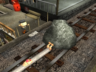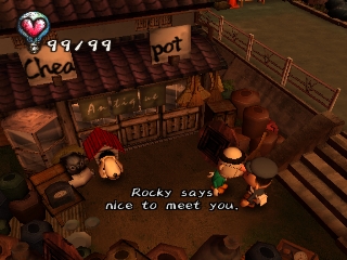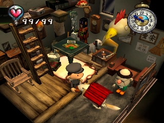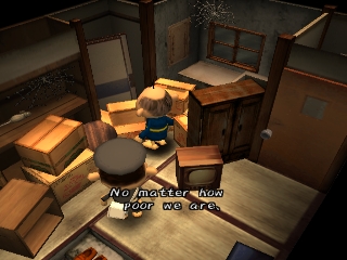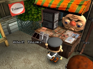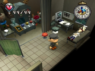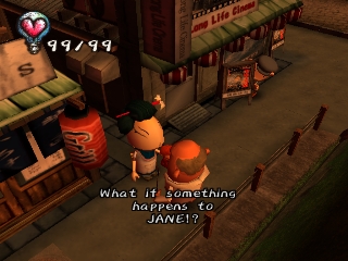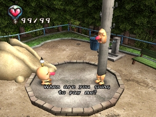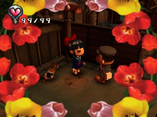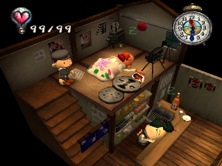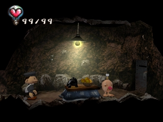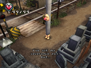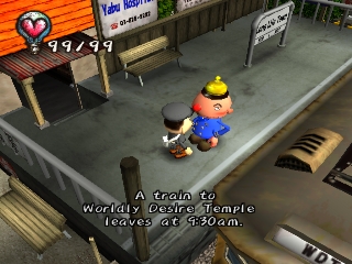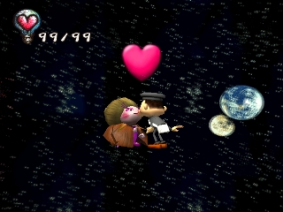 Approaching angry townspeople, doing something they don't like, or injuring himself through various means will take away the protagonist's hearts. When all his hearts are gone, the player must restart or restore a saved game. Hearts can also be regained by sleeping, eating, and certain other tasks. Money is earned by kissing Underground residents (who only show up at certain times of the day), or by selling items found in the garbage. It can be used to buy various items that may help the player get further into the game, or train tickets to travel to new areas.