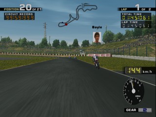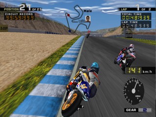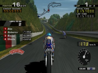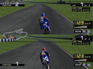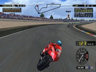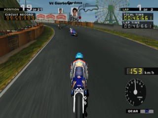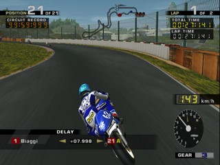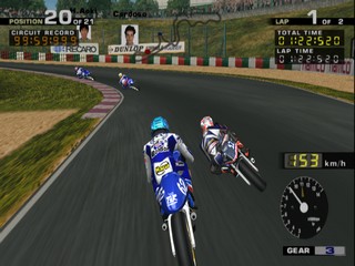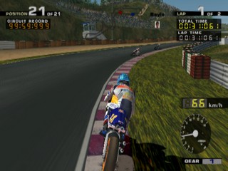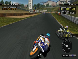 All of the riders from the MotoGP motorcycle championship are here to choose from, including hall of fame riders. As well as the Vs. and Arcade modes, there is also a challenge mode where, much like Gran Turismo's license mode, you must complete certain challenges to unlock new tracks, riders and pictures. These challenges range from beating the clock, to winning certain events in the arcade mode.