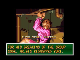 In the first game, Ryo Sakazaki and Robert Garcia set out to find Ryo's sister, Yuri, who has been kidnapped by Mr. Big. Mr. Big has taken the girl to entice Takuma Sakazaki, Ryo's father and originator of the fictional form of karate known as Kyokugen Karate ("Extreme style"), and because Ryo refused to work for Big. After they defeat Mr. Big, Ryo and Robert face the enigmatic Mr. Karate.