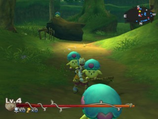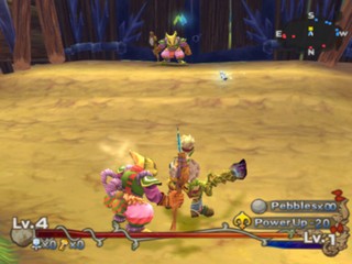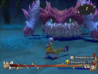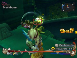 Gameplay is separated by cut-scenes that depict the plot and story using the characters and environments, voice-overs, narration, and pictures. The player controls the main character, Keldy, who wields a sword for attacking, a whip for grabbing and throwing, and pellets for ranged attacks. Unlike the other Mana games there are no shops where equipment or new items can be bought - there are only music tracks and movie clips. Keldy can only enhance his combat performance with certain ribbons and special arrows. Enhancements come through emblems, by meeting certain requirements, left behind by enemies or bought at the Challenge Arena shop. They usually boost the character's basic abilities. Magic is also available through seven different spells.